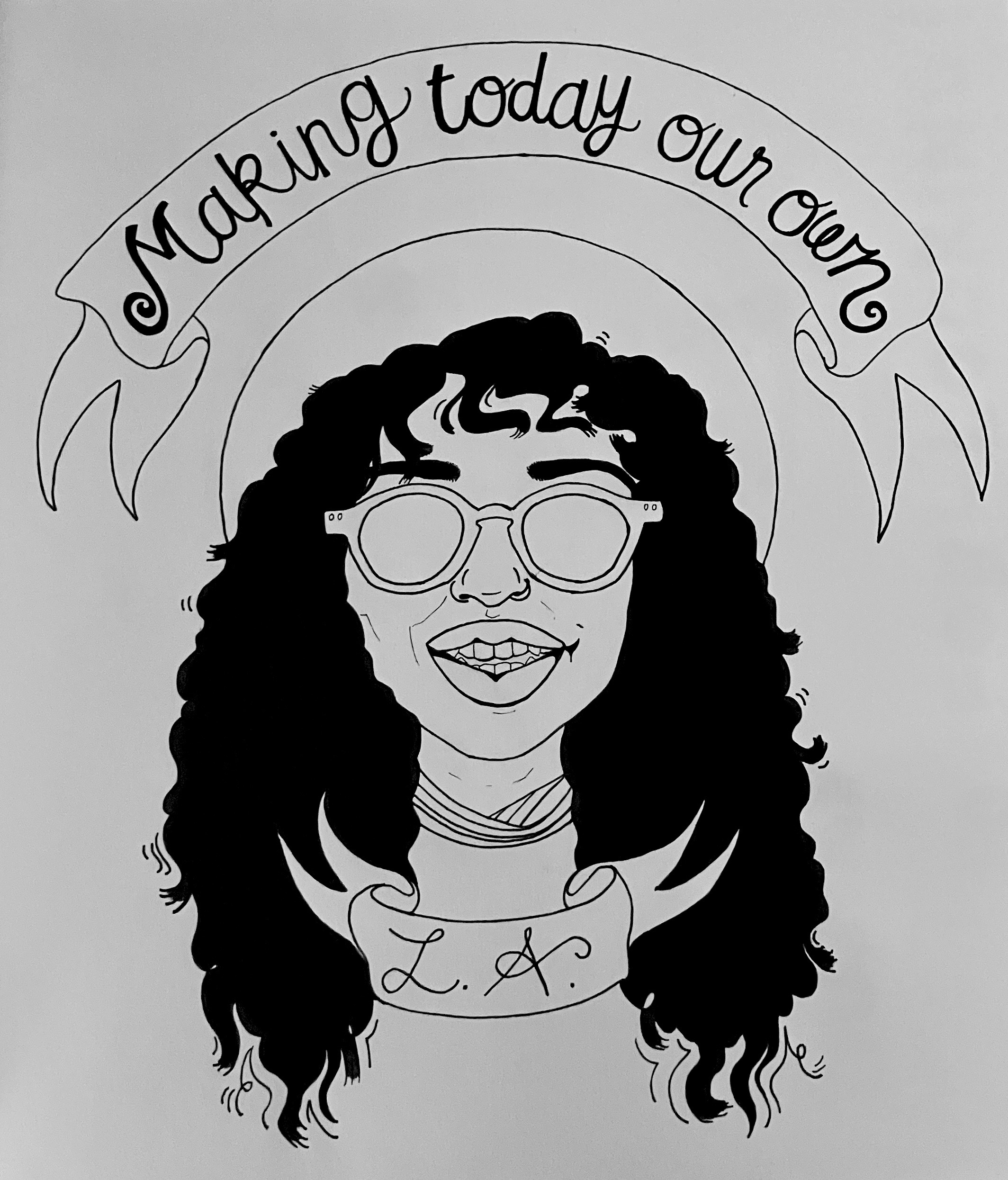 "Before" image of a portrait commission: black ink drawing of a girl in a hat and sunglasses on white paper.