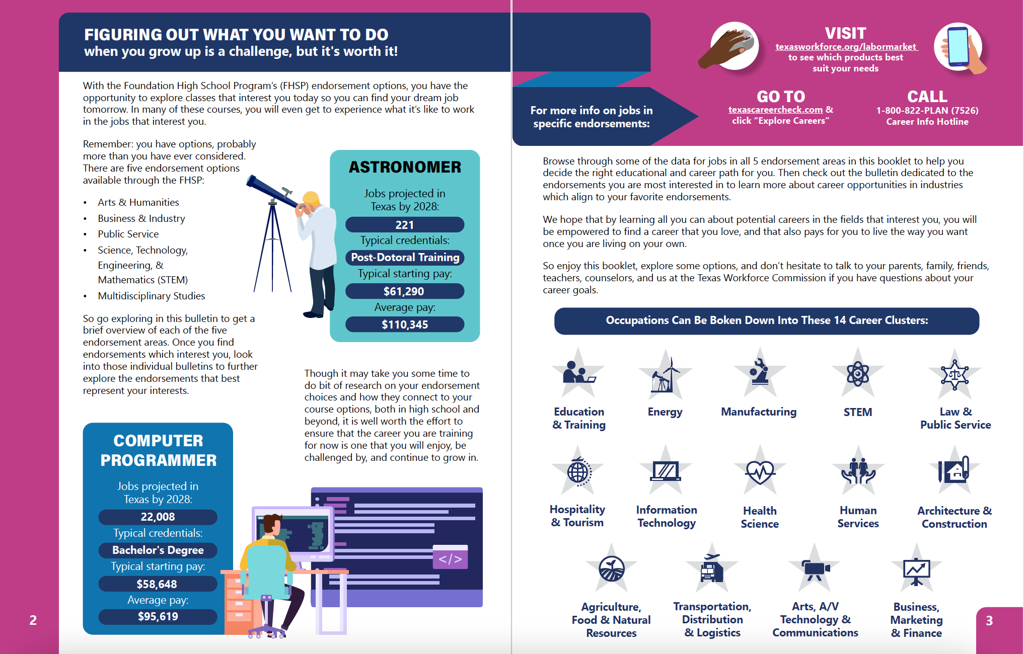 Financial Resources & Planning is a project designed for the Education Outreach branch of the Texas Workforce Commission (TWC). The document points to the various avenues of aid available in Texas for anyone seeking continued education or training beyond high school. The pamphlet is intended for both traditional and nontraditional students as a means to help demystify the processes behind aid distribution. As with all TWC designs, this is available in both print and digital versions.