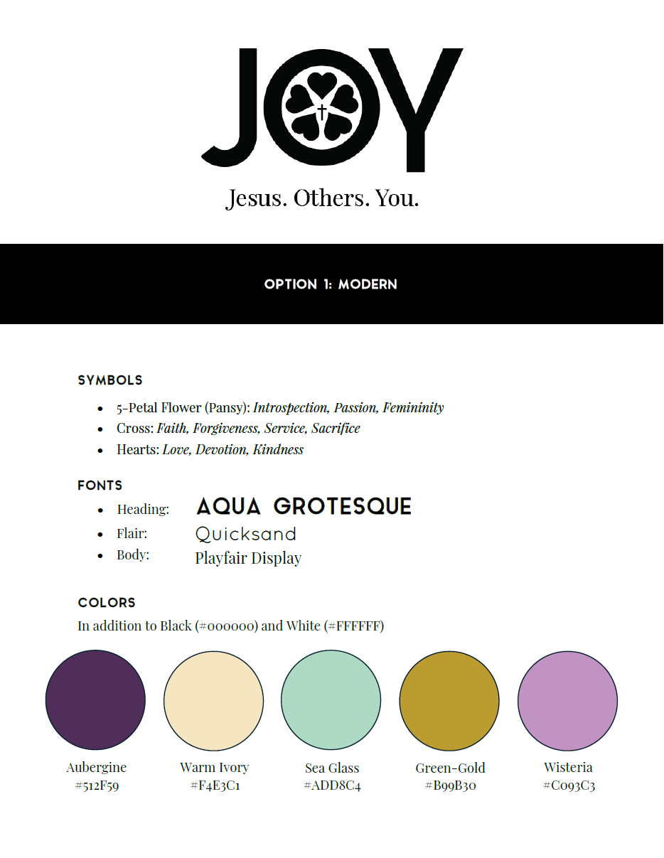 After speaking with the client, I provided three options as a jumping off point. The one pictured here is the “modern” option, which she ultimately chose. The logo merges the requested heart and cross shapes into a stylized pansy, a flower known for symbolizing introspection, passion, and femininity. Its position within the “O” is meant to evoke images of a stained glass church window. The goal with this design was to balance tradition with approachability, furthered by pairing the logo with a modern serif for the tagline.