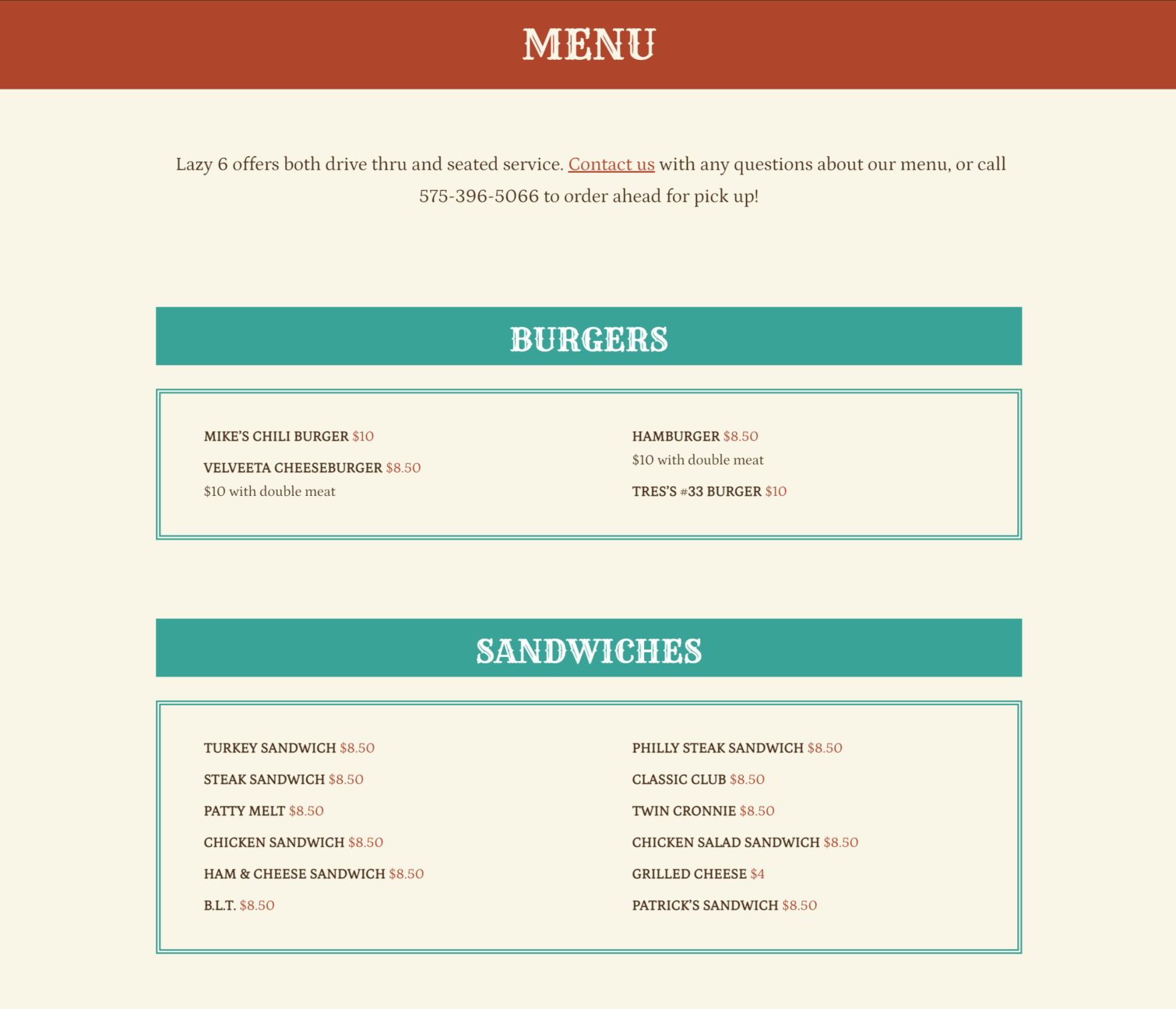 Screenshot of the menu page for the Lazy 6 restaurant website.